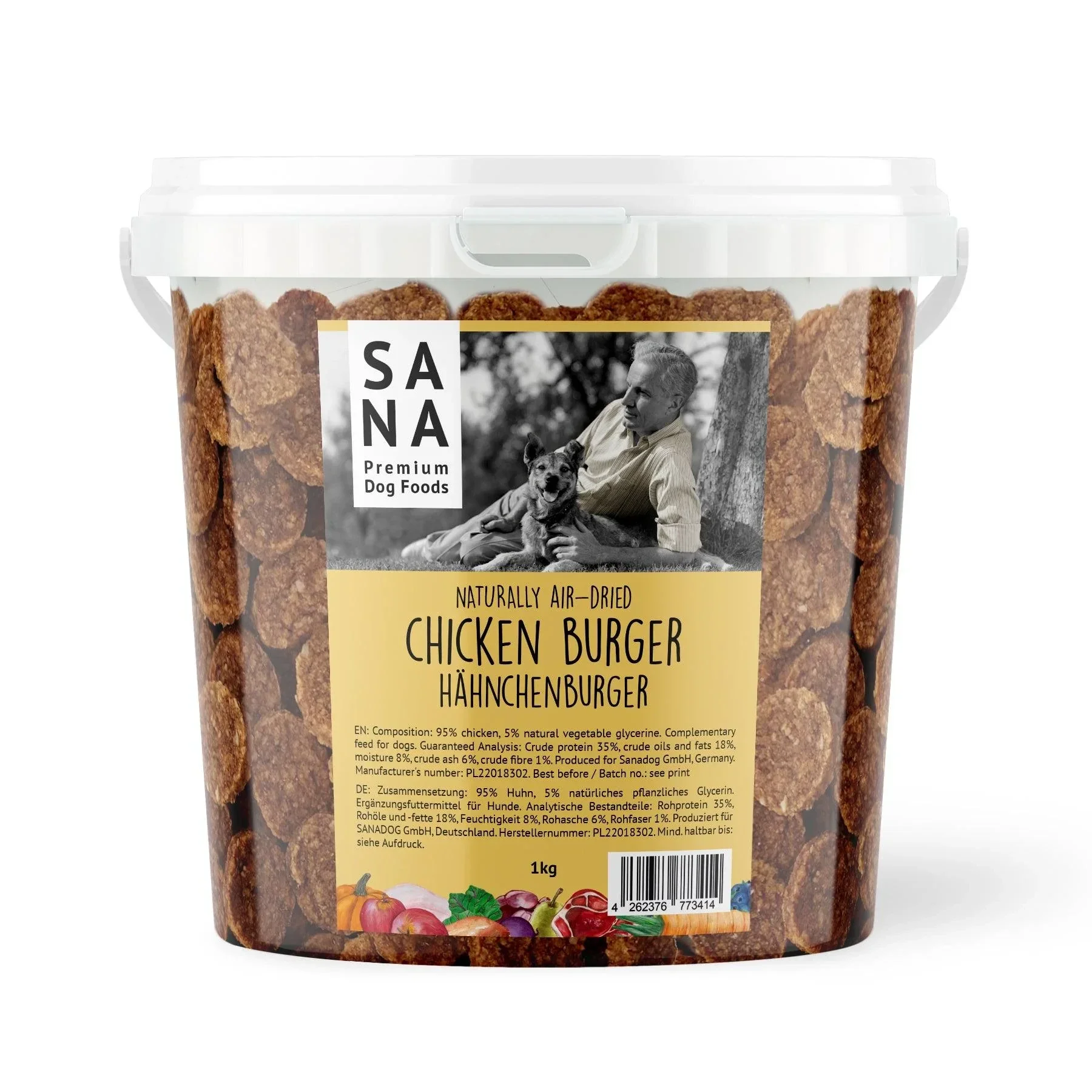 De SANADOG kipburgers zijn geraffineerd met een scheutje glycerine (een vetbestanddeel) gemaakt van raapzaadolie. De gezonde glycerine bindt water en zorgt voor de zachte en taaie consistentie waar honden zo dol op zijn. Met de SANADOG kipburgers krijgt je hond een onweerstaanbaar lekker en tegelijkertijd gezond tussendoortje.